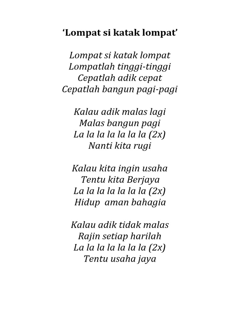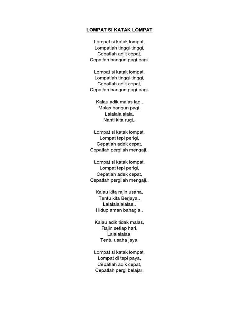 Details of Lompat Si. Lompat si katak lompat Lompatlah tinggi-tinggi Cepatlah adik cepat Cepatlah bangun pagi pagi Lompat si katak lompat Lompatlah tinggi-tinggi Cepatlah adik cepat Cepatlah bangun pagi pagi Kalau Adik malas lagi Malas bangun pagi lalalalala lalalalalalala Nanti kita rugi Lompat si katak lompat Lompatlah tinggi-tinggi Cepatlah adik cepat Cepatlah. Lirik Lagu Lompat Si Katak Lompat gen5629gyklo.